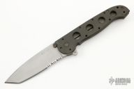 This M16-14 from CRKT features a drop point tanto style bead blasted blade with partial serrations. The handle has a skeletonized stainless steel with a tip down stainless steel pocket clip. Lanyard hole on pommel. Excellent Condition.