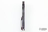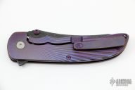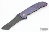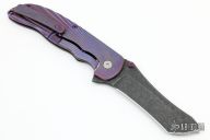 This Norseman (#4658) by John Grimsmo features an acid tumble blade with a single titanium thumb stud, notched thumb ramp and flipper. The handle features anodize finished and sunburst titanium frame with titanium screws. Very smooth action that requires no wrist movement. Nice detent, lockup and blade seating. Rides on ceramic bearings. Knife is in excellent condition, shows no signs of use or carry. Comes with original custom hard case, Nano-Oil, tool, and COA dated March 1, 2021.