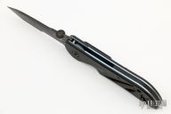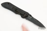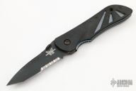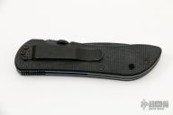 This Mini Stryker by Benchmade features a black finished tanto partially serrated blade with thumbdisc and notched thumbrest. The handle has black G-10 scales, anodized titanium liners, black backspacer, and a tip down black stainless steel clip. Oxidation is visible on the blade otherwise the knife is in good condition.
