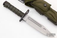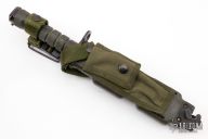 This M9 Phrobis III features a bead blasted spear point blade with sawteeth on the spine and a large fuller, .231" blade stock and 1.446" blade depth, hidden tang construction. The handle has a black steel guard and green plastic grip and can be removed from the handle for cleaning. Comes with original green sheath. Has some sheath marks and some wear on the guard, otherwise good condition.