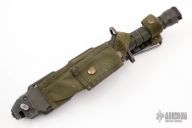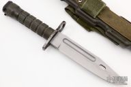 This M9 Phrobis III features a bead blasted spear point blade with sawteeth on the spine and a large fuller, .231" blade stock and 1.446" blade depth, hidden tang construction. The handle has a black steel guard and green plastic grip and can be removed from the handle for cleaning. Comes with original green sheath. Has some sheath marks and some wear on the guard, otherwise good condition.