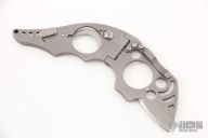BLADE Magazine awarded the Bi-Fold “Most Innovative Imported Knife of 2006”. It folds like a book with the lock-lever inside the hole. Depressing the lever permits the blade to open and positions the index finger through the Perrin index finger hole for complete retention and control. Jimping at the spine and bottom keep everything slip free. Interesting, innovative and functional. Features include: right hand tip-down clip; manual backup safety; spine and choil jimping; blade and handle cutouts reduce weight; flat-saber ground blade. Has a few light scuffs, otherwise excellent condition. Comes with a Spyderco box and papers.