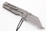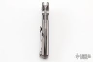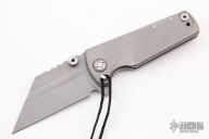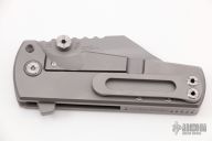 A beefy knife with a deft touch, the Proponent from Artisan Cutlery is one monster of a flipper. The heavy Wharncliffe blade measures in at 3.85" and is made from a 0.18" thick stock of high-quality M390 stainless steel. This gives it a lot of power and weight behind each cut, while the narrow tip provides good penetrative potential. This KnifeCenter exclusive version sports an attractive bead blasted finish, giving it a non-reflective and durable look. The large handles provide a solid grip due to its large finger groove and milled recesses. Handles this large would normally make the knife unwieldy, but being made of lightweight titanium gives just enough reduction of weight to make it user-friendly. The Proponent comes with a threaded pin that can be inserted into the hole near the finger groove to bolt the blade open or closed, providing stability and safety to this monster. The deploying action is extremely smooth thanks to the ceramic ball bearings in the pivot, especially for a knife of this weight and size. The Proponent is an agile touch in a large package. Comes with original box, zippered case and papers. Excellent condition.