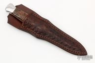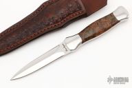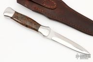 This Dagger by Don Lozier features a two-tone double hollow ground blade with mirror polished grinds and satin flats, mirror polished stainless steel dovetailed bolsters and amboyna burl scales with hidden pins, .180" blade stock and .781" blade depth, full tang construction. Very nice work. Comes with a hand tooled brown leather sheath and a zippered case. Excellent condition.