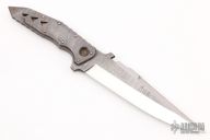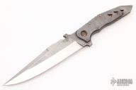This knife by Kazak Knives features a Damascus blade with satin finished grinds and etched flats, sharpened top edge, .204" stock and 1.318" blade depth, full tang construction. The handle has Damascus scales over copper liners, skull crusher at the butt. Comes with a zippered case. Excellent condition.