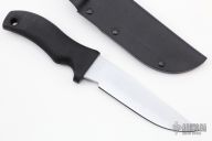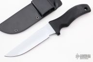 This is a Mad Dog Knives Bear Cat, an awesome EDC with 5-1/2" hard chromed blade made from 3/16" stock. VVTL blade finish (very visible temper line).  The black handle material is compression bonded to the hidden full tang and incredibly ergonomic. Includes a high ride Kydex sheath.  New From Maker!