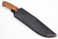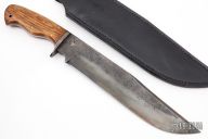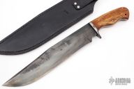 This Avatar Chopper by Jon P Moore features a blued blade with false top edge, .244" blade stock and 2.156" blade depth, full tang construction. The handle has a steel guard and hickory scales. Comes with a black leather sheath. Has some light scratches, otherwise excellent condition.