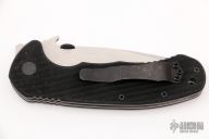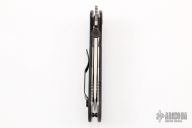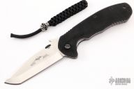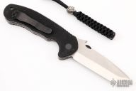This Barracuda by Emerson Knives features a stonewashed tanto blade with swedge, knurled thumb disc, wave feature. The handle is comprised of black G10 scales over titanium liners and black standoffs. Black coated tip up clip and lanyard hole in pommel. Comes with original box, lanyard with bead, and papers. #0080. Has a couple light scuffs, otherwise excellent condition.