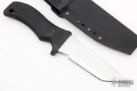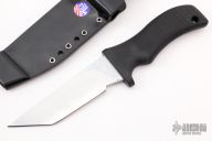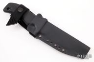 This Taiho by Mad Dog Knives features .247" stock, and 1.421" blade depth, hidden tang construction.  Hard chrome blade finish. The handle is designed to be ergonomic and has the ability to withstand tremendous punishment with little or no damage. It is hard and tough enough to be used as an impact tool. Black composite handle -- compression bonded to the hidden full tang and incredibly ergonomic. The knife comes with a kydex belt sheath.  New from Maker!