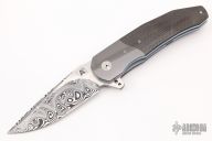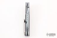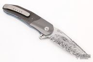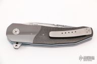 This A2 A3 Flipper flipper from Andre Thorburn and Andre Van Heerden features a Damasteel blade with a false top edge, notched thumbrest and flipper. The handle has zirconium bolsters, carbon fiber scales, carbon fiber backspacer, anodized titanium liners, and a titanium clip, tip up carry. Features DUAL ROW CERAMIC IKBS. Excellent fit and finish. Smooth action. Comes with a nylon zippered case and COA. Has a couple light scratches, otherwise excellent condition.