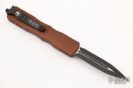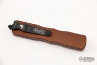 This Dirac OTF automatic by Microtech features a D/E black blade with a standard edges. The handle has a tan aluminum with black stainless steel tip down clip and hardware. Serial number 4242 and dated 02/2020. Comes with original box and papers. Excellent Condition.