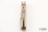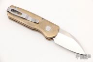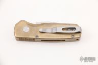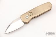 This Runt 5 by Pro-Tech features a mirror polished stonewashed blade with satin finished flats.  The handle features a bronze aluminum frame, a stainless steel tip up pocket clip and a mosaic push button.  Serial numbers may vary from the knife pictured. Comes with original box and papers. Has a couple light scuffs, excellent condition otherwise.
