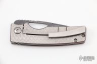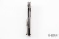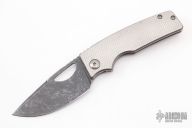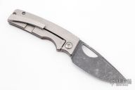 This knife by the OZ Machine Company features an acid washed Z-FiNiT blade with a false top edge, thumbhole and notched thumb rest.  The handle features a milled titanium frame with a titanium tip up pocket clip and backspacer.  Includes box and COA dated 11-1-21. New condition.