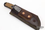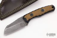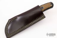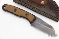 This Valkyrie S by Boros Blades features an acid washed blade with fileworked spine, .136" blade stock and 1.241" blade depth, full tang construction. The handle has brown and black G-10 scales. Comes with a brown leather sheath with Ulti-Clip. Has some scuffs and scratches, otherwise good condition.