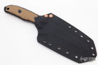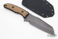 This Minotaur S by Boros Blades features an acid washed blade with textured flats and spine, .188" blade stock and 1.712" blade depth, full tang construction. The handle has brown and black G-10 scales. Comes with a kydex sheath. Has some scuffs and scratches, otherwise good condition.