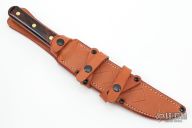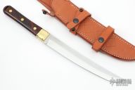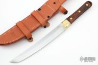 This Shinigami Tanto from Bark River features brass bolsters and desert ironwood burl scales, full tang construction with .192" blade thickness and 1.207" blade depth. Satin finished blade. Comes with a leather sheath and original box. Excellent condition. 1st Production Run