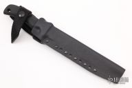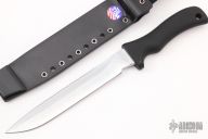 This Shrike 7 by MadDog Knives has a hard chromed, double-edged blade with VVTL finish (very visible temper line) Razor sharp edges with a type 1 choil, the black handle material is the proprietary glass / epoxy composite -- compression bonded to the hidden full tang and incredibly ergonomic. 1/4" blade stock (stout!) and 1" blade depth. Mad Dog trademark on the ricasso – it is the PERFECT knife for everyday carry.  The handle is designed to be ergonomic and has the ability to withstand tremendous punishment with little or no damage. It is hard and tough enough to be used as an impact tool. Includes a kydex sheath.  New From Maker!