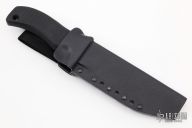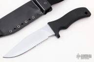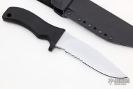 This SERE Instructor by MadDog Knives features a partially serrated blade. .255" stock. 1.479" blade depth. Selectively tempered, the knife has a Rockwell C-scale hardness of 62 at the edge (as hard as a file), and HRC 50-54 throughout the spine and hidden full tang. Hard chrome blade finish.  The handle is designed to be ergonomic and has the ability to withstand tremendous punishment with little or no damage. It is hard and tough enough to be used as an impact tool. Includes a kydex sheath.  New From Maker!