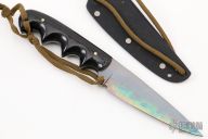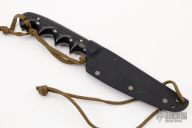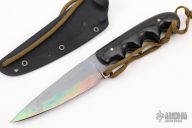 This Agent Stiletto by Fred Perrin features a black drop point blade with notched thumbrest, visible temper line, .151" blade stock and 1.191" blade depth, full tang construction. The handle is comprised of contoured black linen micarta scales with nickel silver pins and lanyard hole. Includes kydex sheath and a zippered case. Excellent condition.