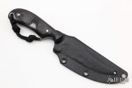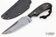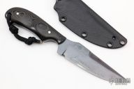This Light PPF from Fred Perrin features a clip point blade with visible hamon, swedge and notched thumbrest, .149" blade stock and 1.160" blade depth, full tang construction. The handle is comprised of black linen micarta with nickel silver pins. Lanyard hole with lanyard in pommel. Includes kydex sheath and zippered case. Has a couple light scratches, otherwise excellent condition.