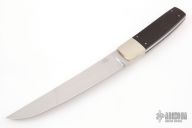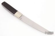 This Tanto by Fred Carter features a hand rub satin finished blade, full tang construction with .248" blade stock and 1.326" blade depth. The handle has nickel silver bolsters, ebony scales with nickel silver pins. Has some light scratches, otherwise excellent condition.