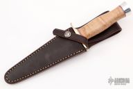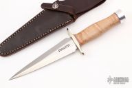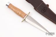 This Model 13-6 Small Arkansas Toothpick by Randall Made Knives features a satin finished double edged blade with .218" blade stock and 1.416" blade depth, hidden tang construction. The handle is comprised of a nickel silver guard, duralumin butt and a maple grip with red/white/blue spacers. Includes a waxed brown leather sheath with belt loop. Excellent condition.