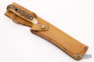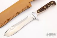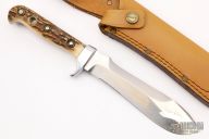 The White Hunter is the ultimate outdoorsman’s knife, originally designed by African professional hunters. It features a curved blade for cutting, slicing and skinning and a strong back edge for hacking. Handmade by skilled craftsmen with stag scales, it has a 6-inch blade, 10.75 inch overall length, custom proofed Rockwell hardness, and comes with original brown leather sheath. Excellent condition.