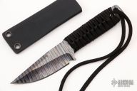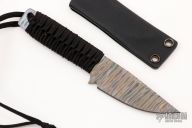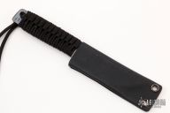 This knife by Mick Strider features a flame anodized titanium chisel ground blade with black cord wrap, .145" blade stock and 1.120" blade depth, full tang construction. Comes with kydex sheath. Excellent condition.