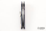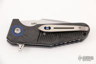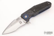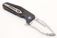 This Pocket Rocket by Shane Sibert features a hand rub satin finished blade with notched thumbrest and flipper. The handle has a milled carbon fiber scales, titanium hardware, blue g10 pivot collars, tip up anodized titanium clip with roller. Rides on bearings, nice detent, lockup and blade seating. Comes with a zippered case. Excellent condition.