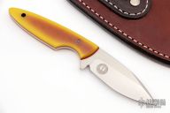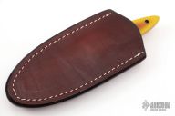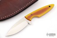 This fixed blade by Chris Taylor features a satin finish blade with .105" Blade Stock and .925" Blade Depth, full tang construction. The handle features vintage two-tone paper micarta scales with a micarta pin and Brass lanyard hole. Includes a brown leather sheath and COA dated 9/20/22. AEBL - Cryo Treated 62HRC. New from maker.
