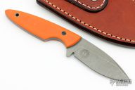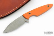 This fixed blade by Chris Taylor features a stone wash finish blade with .105" Blade Stock and .925" Blade Depth, full tang construction. The handle features G10 scales with a micarta pin and stainless lanyard hole. Includes a brown leather sheath and COA dated 9/20/22. AEBL - Cryo Treated 62HRC. New from maker.