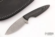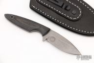 This fixed blade by Chris Taylor features a stone wash finish blade with .105" Blade Stock and .925" Blade Depth, full tang construction. The handle features micarta scales with a micarta pin and stainless lanyard hole. Includes a black leather sheath and COA dated 9/20/22. AEBL - Cryo Treated 62HRC. New from maker.