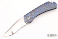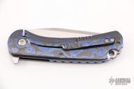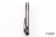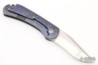 This Rebel Framelock Kickstop Flipper by Jim Burke features a multi-ground rub satin finished blade with kickstop flipper. The handle has a zircuti frame and clip with anodized titanium backspacer. Comes with a velcro case. Rides on bearings, nice detent, lockup and blade seating. Excellent condition.