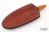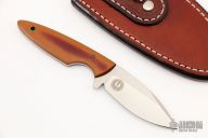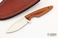 This fixed blade by Chris Taylor features a satin finish blade with .105" Blade Stock and .925" Blade Depth, full tang construction. The handle features vintage two-tone paper micarta scales with a micarta pin and brass lanyard hole. Includes a brown leather sheath and COA dated 9/20/22. AEBL - Cryo Treated 62HRC. New from maker.