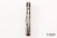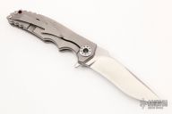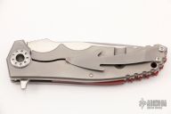 This Devastator by RJ Martin features a tumble finished recurve blade with notched thumbrest and flipper. The handle has a bead blasted titanium frame with Jersey Devil tail milled on the front, tip up Jersey Devil tail titanium clip and a red G-10 backspacer. Has pivotless pivot designed by Matthew Martin. Comes with a Bill's Velcro case. Has some light scuffs and scratches, excellent condition otherwise.
