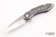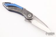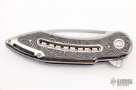 This is a Glimpse linerlock flipper by Todd Begg features a Doug Ponzio Damascus blade with hand rub satin finished grinds and a flipper. The handle has polished titanium scales with Doug Ponzio Damascus inlays and cracked ice textured titanium liners and tip up clip. Includes Ceramic IKBS (Ikoma-Korth Bearing System) for smooth and fast flipper opening that requires no wrist action. Comes with a zippered case. Excellent condition.