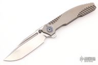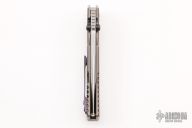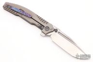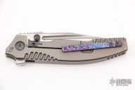 This Snafu 3.0 Integral Flipper by Custom Knife Factory is a Peter Rassenti design. It features a two-tone blade with notched thumbrest and flipper. The handle has a bead blasted and anodized titanium frame and tip up timascus clip, timascus pivot collars. Rides on bearings, nice detent, lockup and blade seating. Has a stainless lockface insert. Comes with Velcro case, COA #89 and extra hardware. Has a few light scuffs, otherwise excellent condition.