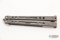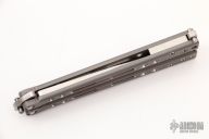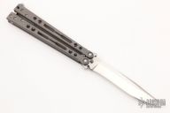 This Specter Balisong from Jerry Hom features a satin finish recurve blade with swedge. The handle is comprised of bead blasted and skeletonized titanium handles with satin titanium backspacers and T latch. Comes with a zipper case. Has some light scuffs and scratches, otherwise excellent condition.