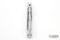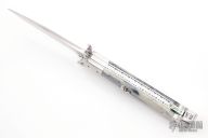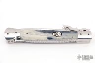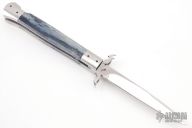 This swing-guard auto by Burn Knives features a mirror polished bayonet ground blade with a false top edge. The handle has stainless bolsters and swing guard, blue giraffe bone scales, stainless steel liners, and a fileworked stainless steel backspace with abalone inlays. Comes with a zipper case. Has a little vertical blade play, otherwise excellent condition.