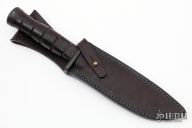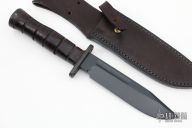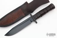 This knife by Barry Dawson features a black drop point blade with false top edge, .268" blade stock and 1.372" blade depth, hidden tang construction. The handle has a black steel guard with stacked leather handle and a black steel butt. Comes with a brown leather sheath. Excellent condition.