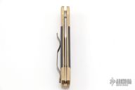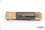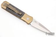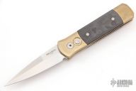 This 7114-CAMO Godson from Pro-Tech Knives features a satin finished blade with swedge. The handle has a stonewashed bronze frame with Camo Fat Carbon inlays, anodized and stonewashed titanium tip up pocket clip and a black-lip-pearl button.  New From Maker. Comes with original box and papers.