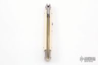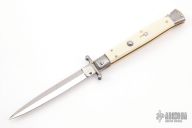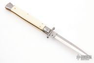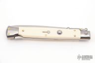 This 11" Swing Guard Auto by Frank Beltrame features a polished bayonet ground blade with false top edge. The handle has stainless steel bolsters, front and rear, imitation ivory scales, brass liners, stainless spring. Excellent Condition.
