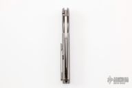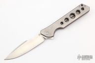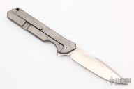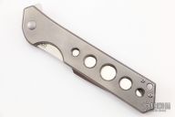 This Rainmaker by Olamic Cutlery features a satin finished blade with a notched flipper. The handle has a light blasted titanium frame with matching titanium tip up pocket clip and titanium floating backspacer. Nice detent, blade seating and lock up. Includes original zippered case and COA dated 8-19-19. Excellent condition.