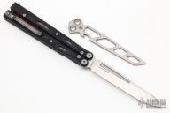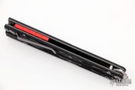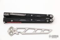 This Balisong by Maxace Knives features a satin finished 14C28N blade with false top edge. The handle has black G-10 scales, , titanium liners , red aluminum  spacers, tip up stainless steel clip and T-latch. Comes with original box and trainer blade. New from maker.