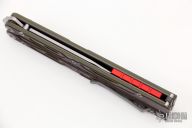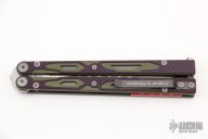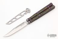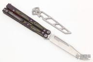 This Balisong by Maxace Knives features a satin finished 14C28N blade with false top edge. The handle has purple/green G-10 scales, titanium liners , red aluminum  spacers, tip up stainless steel clip and T-latch. Comes with original box and trainer blade. New from maker.