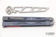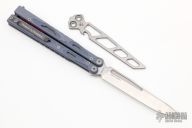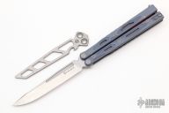 This Balisong by Maxace Knives features a satin finished 14C28N blade with false top edge. The handle has Gray G-10 scales, titanium liners , red aluminum  spacers, tip up stainless steel clip and T-latch. Comes with original box and trainer blade. New from maker.