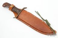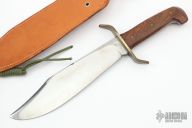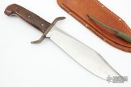 This W49 Bowie by Western Cutlery features a mirror polished bowie blade with a false top edge, .157" blade stock and 2.101" blade depth, full tang construction. The handle has a brass s-guard, wood scales with brass pins. Comes with a brown leather sheath. Has some light scratches and patina, otherwise excellent condition.