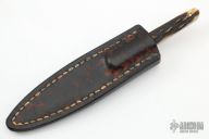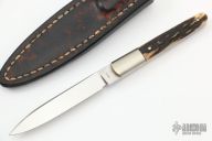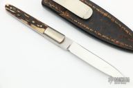 This knife by David Shaw features a hand rub satin finished spear point blade, .179" blade stock and .559" blade depth, full tapered tang construction. The handle has  nickel silver bolsters, stag scales and black liners. Comes with a brown leather sheath with boot clip. Excellent condition.