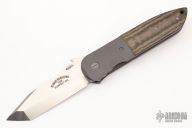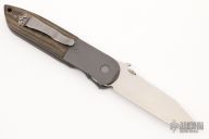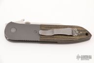 This Super CQC-6 Suspect Six by Ernie Emerson features a hand-ground, satin finished tanto style chisel blade, bead blasted titanium bolsters, and green micarta scales. Stainless steel clip. Notches on thumbrest and lockbar. This beast of a knife features Emerson's Wave feature. Has a couple light scuffs on the bolsters, otherwise excellent condition. Comes with original box and papers.
