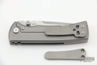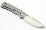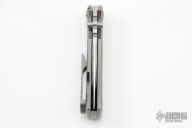 This Chaves Ultramar Redencion drop point features a satin finished blade with the Chaves logo, dual thumbstuds, and notched thumbrest. The handle is made up of tumbled titanium, skull pocket clip (positioned for tip up carry), and a matching titanium backspacer. Has overtravel stop. Blade is centered when closed, and locks up with no play. Comes with box and additional clip. Excellent condition.